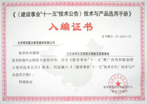 - 2007年被选入《建设业“十一五” 技术公告技术与产品选用手册》